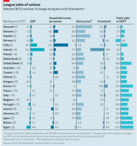 Comparația Produsului Intern Brut (PIB) cu finalul anului 2019, cel dinaintea pandemiei, arată sănătatea economiei, notează publicația financiară. Anumite țări au părut vulnerabile la interdicțiile de călătorie și au înregistrat un colaps în domeniul serviciilor, în particular cele din sudul Europei, care se bazează masiv pe turism. Altele, precum Belgia și Marea Britanie, au avut niveluri ridicate de infecții cu noul coronavirus și morți, ceea ce a limitat consumul.