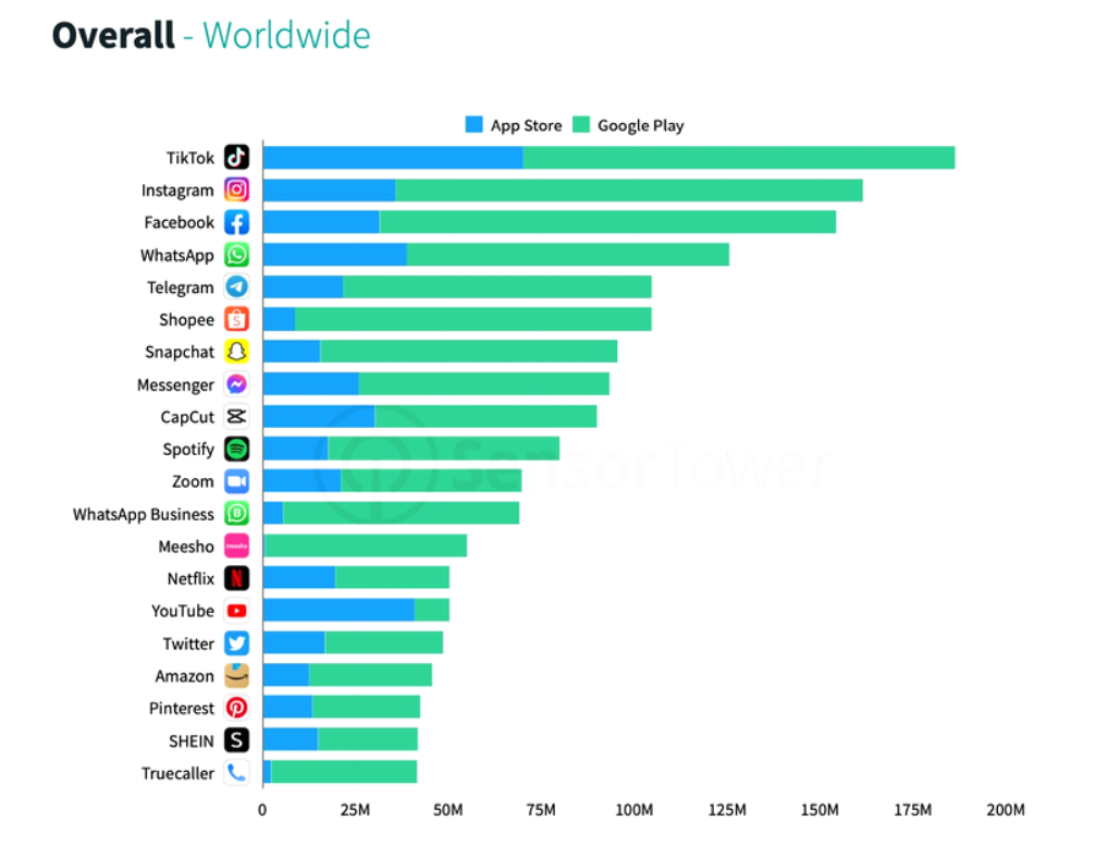 TikTok conduce topul cu peste 175 de milioane de download-uri la nivel mondial în primul trimestru al anului, urmat de Instagram , care se învârte în jurul a 155 milioane de descărcări, iar apoi vine Facebook cu 150 milioane. Acest clasament este realizat de SensorTower, care măsoară doar descărcările individuale din magazinele de aplicații, nu și aplicațiile preinstalate care vin pe telefoanele cu Android.