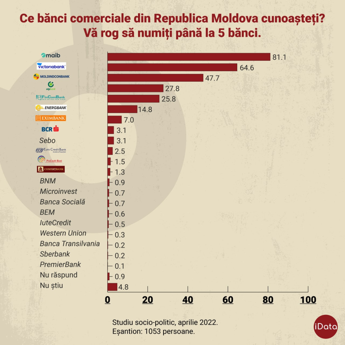 Cele mai cunoscute 3 bănci din RM sunt: Victoriabank (96.9%), MAIB (96.4%), Moldindcombank (95.7%). De OTP Bank au auzit 75.8% din respondenți, de Energbank – 74.7%, de FinComBank -74.3%, de Eximbank -73.5%.