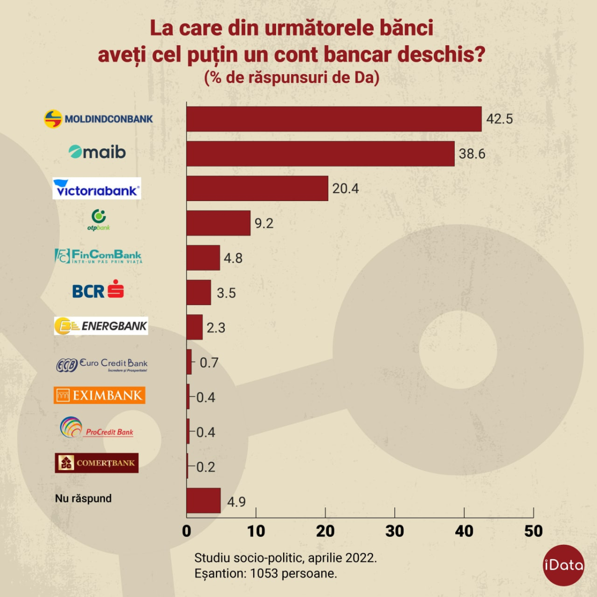Cei mai mulți dintre moldoveni au deschis un cont bancar la Moldindcombank (42.5%). Topul este urmat de maib cu 38.3%. Pe locul trei se află Victoriabank cu 20.4%. Topul este continuat cu OTP Bank (9,2%) și Fincombank (4,2%).
