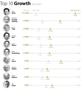 De la debutul pandemiei, Musk averea sa a crescut cel mai rapid în top 10 milairdari. În al treilea trimestru din 2021, venitul net Tesla a depășit 1,6 miliarde de dolari – un record al companiei. Această creștere l-a ajutat pe antreprenor să devină prima persoană care a trecut pragul averii nete de 300 de miliarde de dolari.