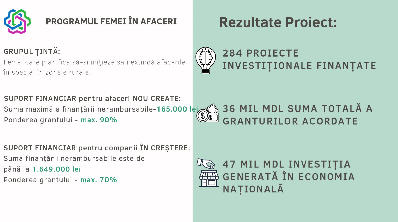 În cadrul evenimentului online, dedicat rezultatelor obținute pe parcursul celor 3 ani și jumătate de activitate, au fost evidențiate obiectivele agreate la începutul proiectului, care s-au transformat în realizări tangibile pentru cetățenii Republicii Moldova. Totodată, au fost exemplificate companii, care au beneficiat de suport european pentru inițierea sau dezvoltarea unei afaceri în mediul rural, iar produsele sau serviciile acestora au devenit branduri naționale, bucurându-se de succes și pe alte piețe externe.