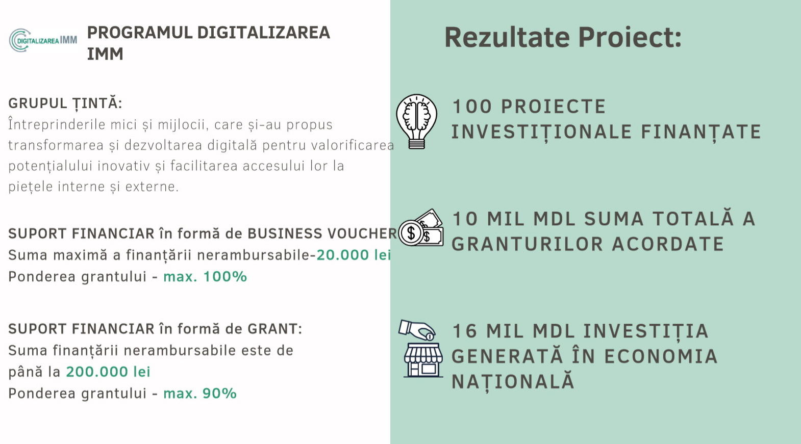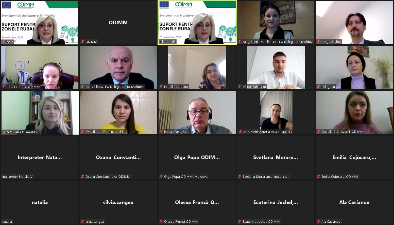 La data de 18 noiembrie 2021, au fost prezentate rezultatele proiectului finanțat de Uniunea Europeană “Suport pentru ÎMM în zonele rurale”. Suportul financiar oferit de Uniunea Europeană, în valoare de 4 milioane de euro, a fost direcționat, prin intermediul Organizației pentru Dezvoltarea Sectorului Întreprinderilor Mici și Mijlocii (ODIMM), pentru implementarea Programelor naționale „PARE 1+1″, „Femei în Afaceri” și a „Instrumentului de susținere privind digitalizarea ÎMM”. Pe parcursul a trei ani și jumătate de implementare a Proiectului, 568 de companii au fost susținute financiar în sumă totală de circa 91 milioane lei, care au generat peste 163 milioane lei investiții în economia națională.