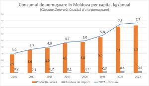 Aproape 95% din pomușoarele consumate, adică 7,3 kg per capita, provin din producția locală, subliniind contribuția semnificativă a agricultorilor moldoveni la piața de pomușoare. Restul, aproximativ 0,4 kg per capita, reprezintă importuri, de obicei aduse în afara sezonului de producție internă.