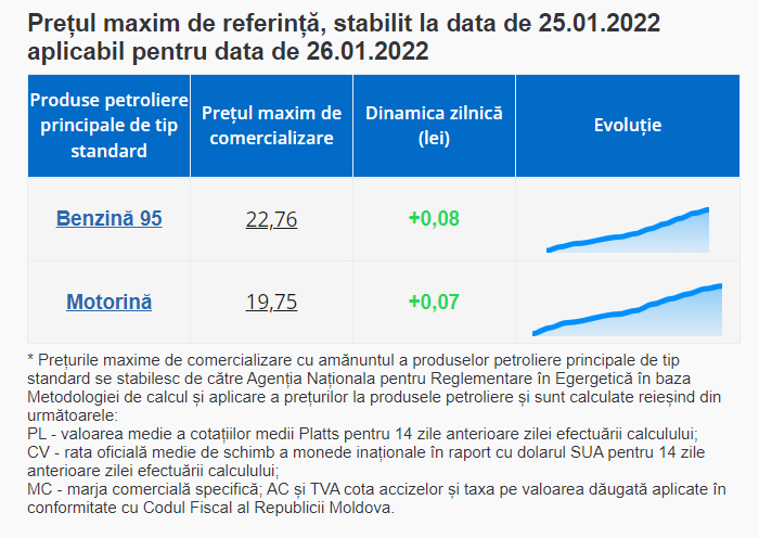 Astfel, mâine, 26 ianuarie 2022, litrul de benzină va costa 22,76 de lei, iar cel de motorină – 19,75 lei.