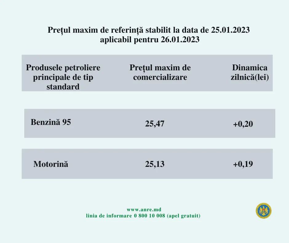 Agenția Națională pentru Reglementare în Energetică (ANRE) a publicat prețul carburanților pentru data de 26 ianuarie 2023. Benzina și motorina își continuă tendința de scumpire.