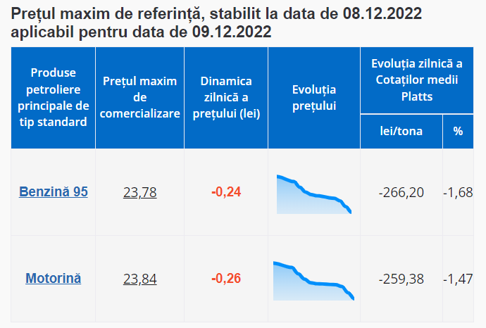 Potrivit informațiilor, vineri, 9 decembrie, benzina se va ieftini cu 0,24 lei, iar motorina cu 0,26 lei. Mai exact, litrul de benzină va costa 23,78 lei, iar litrul de motorină 23,84 lei.