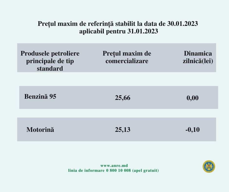 De menționat că, de la 1 septembrie 2021 au intrat în vigoare modificările la legea produselor petroliere. Așadar, ANRE stabilește prețurile plafon pentru benzina cu cifra octanică 95 și pentru motorină.