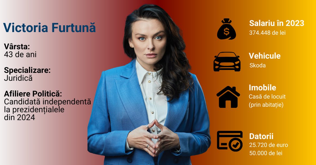 Fosta procuroră anticorupție, Victoria Furtună, a fost înregistrată oficial în cursa pentru prezidențiale pe 24 septembrie curent. Candidează independent la funcția de președintă și este juristă de profesie. Furtună s-a născut pe 24 februarie 1981, în orașul Hîncești. Este căsătorită și are doi copii. Cunoaște limba română și rusă.