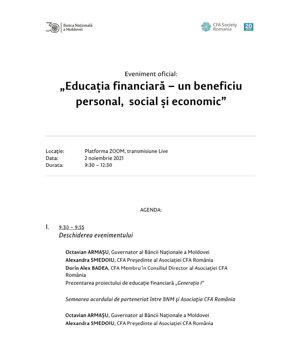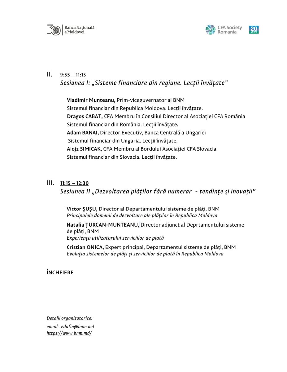 În cadrul întrunirii preconizate, va fi încheiat un acord de parteneriat între Banca Națională a Moldovei și Asociația CFA România pentru implementarea proiectului. De asemenea, evenimentul va fi structurat în două sesiuni: „Sisteme financiare din regiune. Lecții învățate” și „Dezvoltarea plăților fără numerar – tendințe și inovații”.