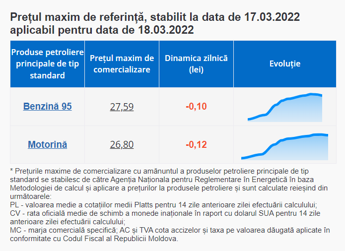Agenția Națională pentru Reglementare în Energetică (ANRE) a afișat prețurile la carburanți: benzină și motorină pentru 18 martie 2022. După o perioadă îndelungată de scumpiri, benzina și motorina se ieftinesc. Prețul la benzină a scăzut cu 0,10 lei, iar la motorină cu 0,12 lei.