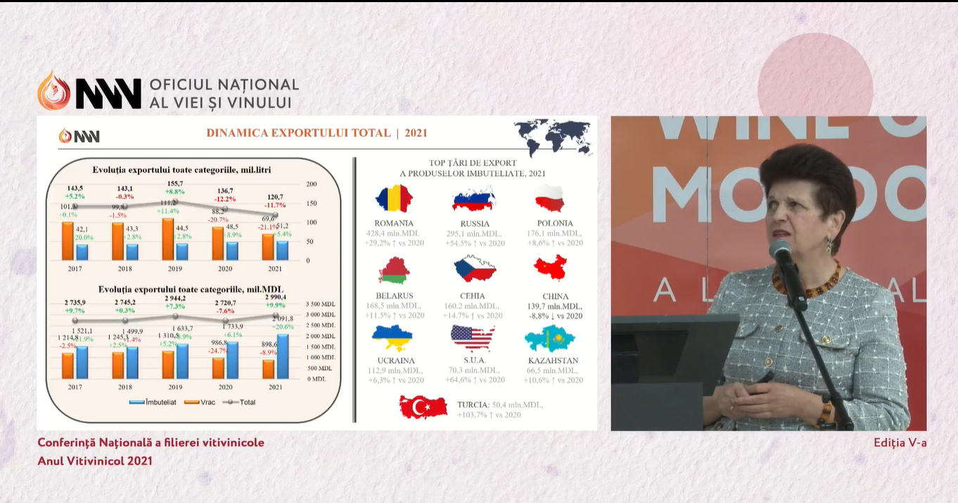 Potrivit raportului, în anul 2021, s-au exportat în total 120,7 milioane de litri, dintre care 51,2 milioane de litri a fost vin îmbuteliat, ceea ce constituie 69,3 milioane de sticle, iar alți 69,6 litri a fost vin în vrac, cantitatea căruia a scăzut cu 21,1% față de anul 2021.