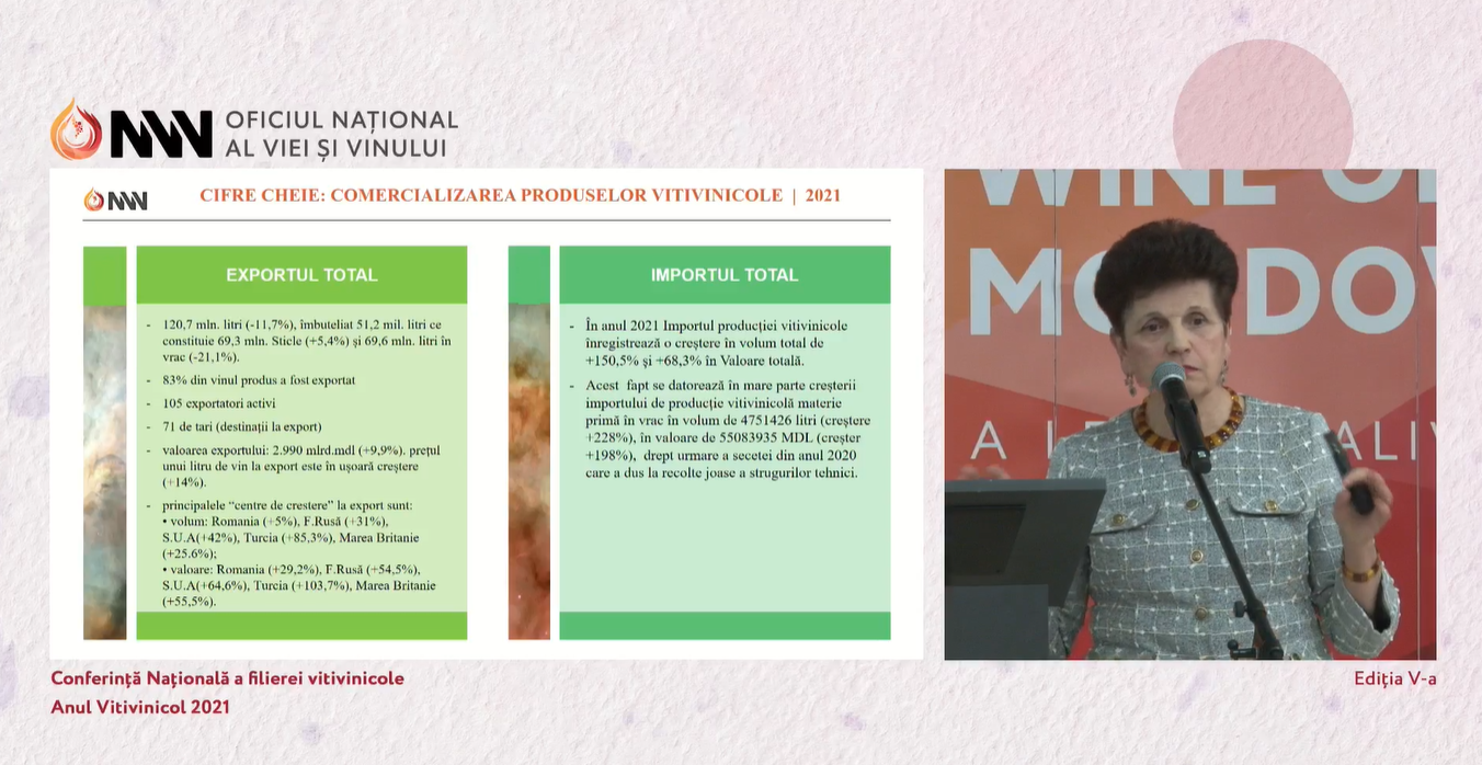 În anul 2021, vinurile moldovenești au ajuns în 71 de țări. Astfel, s-a exportat 83% din totalul de vin produs. Cea mai importanță piață a fost țara vecină – România. Datele au fost prezentate de Elizaveta Breahnă, directoare interimară a Oficiului Național al Viei și Vinului în cadrul Conferinței Naționale cu genericul „Anul Vitivinicol 2021. Evaluări, rezultate și perspective” organizată astăzi 8 aprilie.