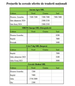 „Prețul grâului a atins nivelul record – în regiunile centrale (Șoldănești, Florești) ajungea chiar la 3 500 lei/t (alimentar) și 3 200 lei/t (furajer)- preț care nu a mai fost înregistrat în acest sezon. La situația din 25 iunie 2024, valoarea grâului a coborât brusc la 2800 lei/t pentru alimentar și 2700 lei/t pentru cel furajer, preț luat pentru regiunile centrale ale țării. Traiderii naționali propun următoarele valori pentru grâu: Crist Valg SRL- 3000/3100 lei/t (recolta veche) livrat la elevator Iargara, Cereale Glodeni SRL- 2750-2800 lei/t (recolta veche) zona Nord. Ancom Agro SRL oferă prețul de 2350/2550 lei/t pentru recolta nouă livrată la elevatorul Gura Camencii”, susține Rija.