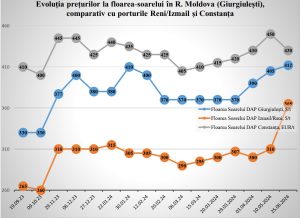 Rapița românească a suferit și ea sub presiunea unei cereri limitate, prețurile stabilizându-se la aproximativ 440 EUR/t DAP Constanța, în timp ce recolta semințelor de floarea-soarelui în Bazinul Mării Negre a arătat o perspectivă pozitivă. În Moldova, interesul pentru floarea-soarelui a fost susținut, cu prețuri competitive oferite de traideri în diverse regiuni. Cantitățile rămase la cei existenți sunt de până la 25-50 tone, ce nu e semnificativ. Dar vorbim și de o piață fără cumpărător procesatorii nu cumpără, iar traiderii sunt interesați de a achiziționa ultimele volume în zona Giurgiulești. Prețul la floarea soarelui propus de Orom-Imexpo SRL este de 8200 lei/t în Giurgiulești, Cereale-Glodeni SRL propune prețul de 7200 lei/t în regiunea Nord, iar Ancom-Agro SRL prețurile de 7200/7300/7400 pentru zonele Nord, Centru și Sud respectiv.