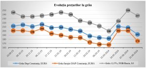 În portul Constanța, prețul grâului a înregistrat o scădere rapidă, coborând cu 38 EUR/t în doar două săptămâni, până la 192 EUR/t. Această evoluție a fost reflectată și în alte regiuni: în Republica Moldova, prețurile grâului au urmat o traiectorie similară, atingând cote record la începutul lunii, dar coborând considerabil până la sfârșitul lui iunie.
